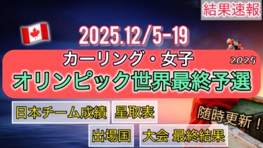 こんにちは、いまときです。 この記事では、カーリング・オリンピック世界最終予選2025(女子)の結果速報をお伝えします。 大会期間は2025.12/5(金)〜12/19(水)です。時差は17時間です。 (adsbygoogle = wind...